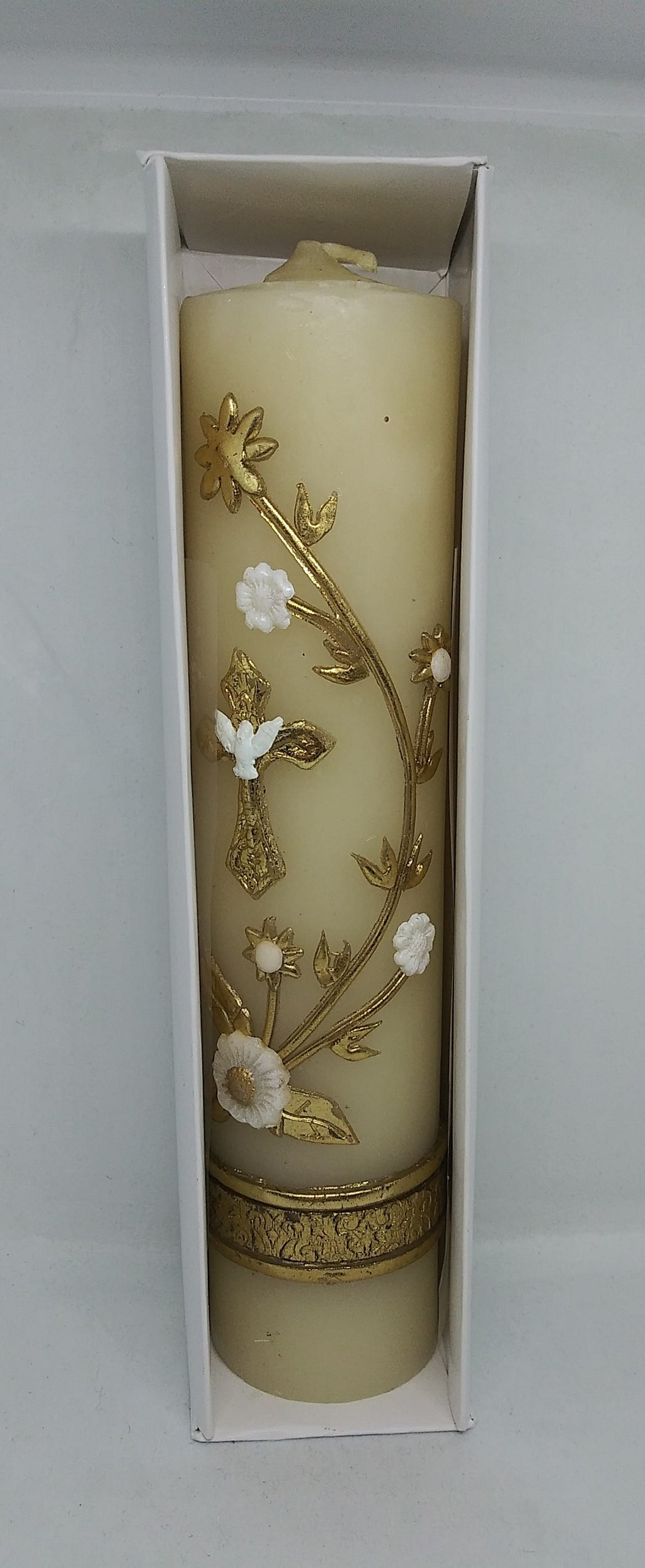 • Features small embossed gold gross with white dove and flowers